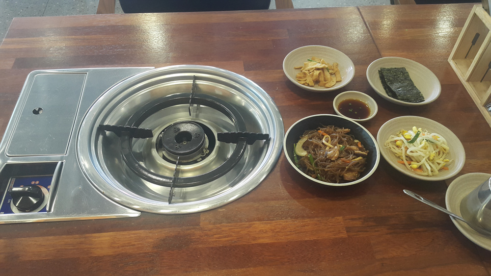 반찬은 잡채, 어묵, 콩나물, 김입니다.