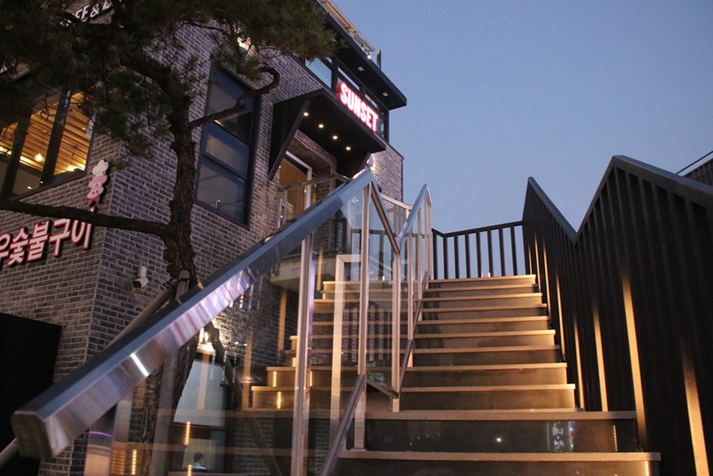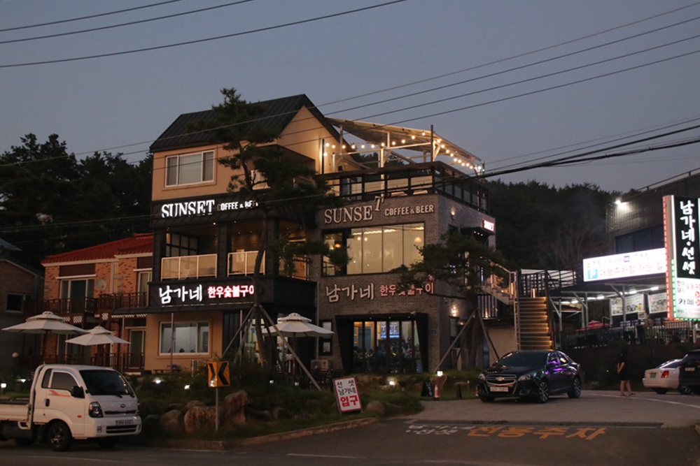 선셋 카페는 카페에서 해지게다리와 석양을 감상할 수 있는 전망 좋은 자리에 위치하고 있습니다.1층은 정원과 식당이며 2층과 3층을 선셋카페로 활용하고 있는데
