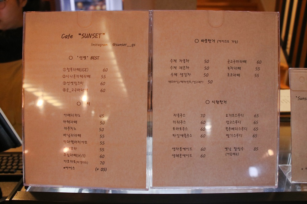 선셋 카페의 메뉴는 커피, 선셋 BEST, 따뜻한 거, 시원한 거, 이렇게 분류를 해놓았네요