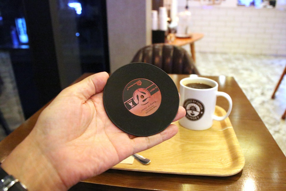 커피 받침대가 재미있게 레코드판디자인을 하고 있습니다.