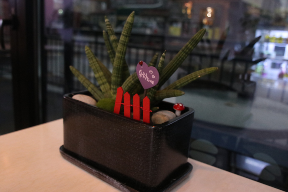 테이블에는 작은 화분이 하나씩 놓여있다.