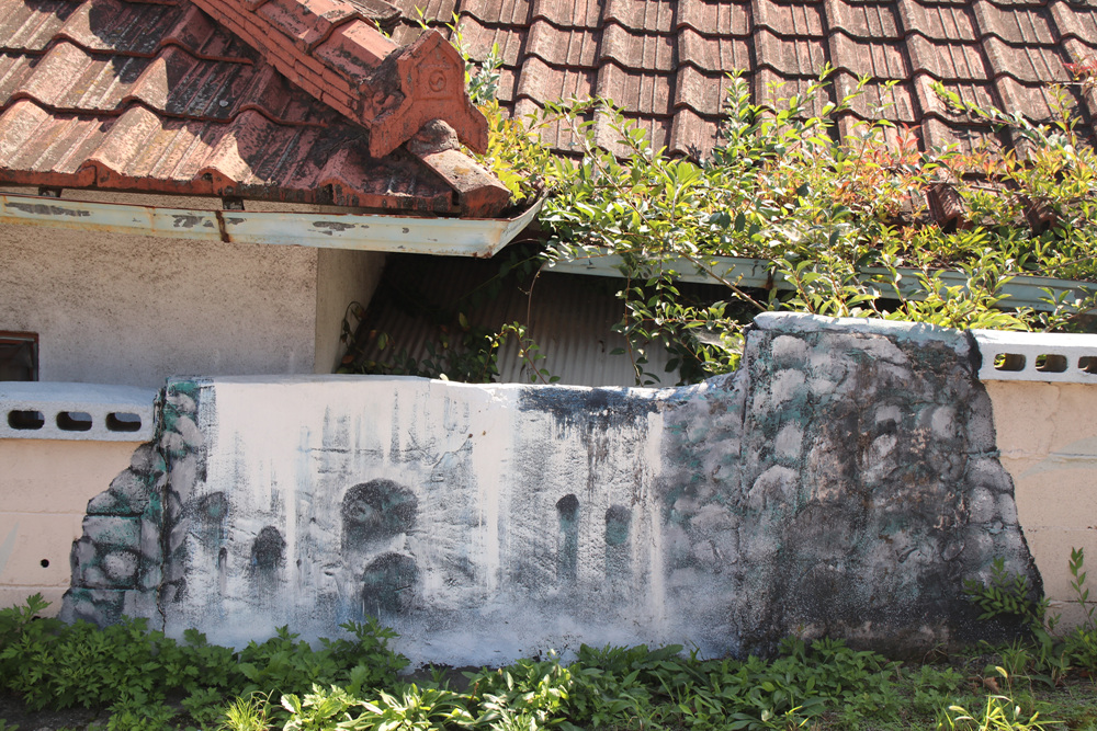 거대한 폭포를 그린것그린 것 같은 벽화인데 요즘 불 수 있는 사방댐을 그린 것으로 보입니다. 이 벽화는 기와지붕과 잘 어우러져 마치 기와가 물결모양을 이루며 흘러내리는 것을 기본으로 한 것 같습니다.