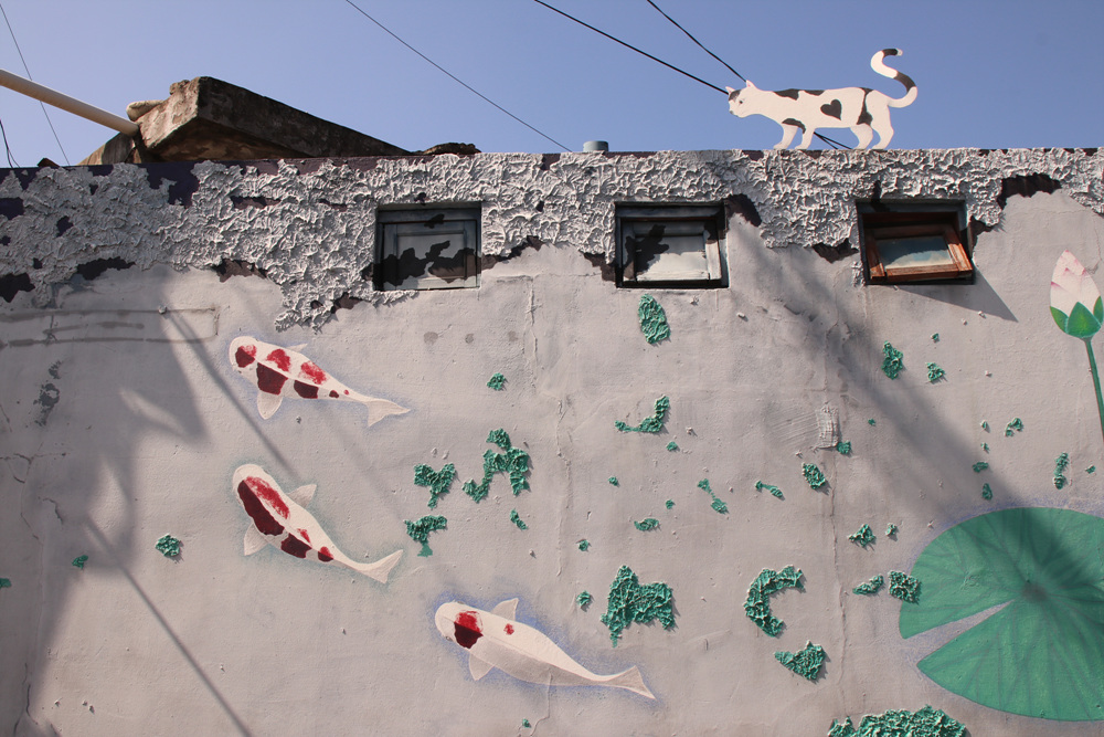 연못에 물고기가 노닐고 있고 그 위로 고양이가 물고기를 바라보고 있는 벽화인데 특히 고양이는 돌출조형물로 제작되어 입체감을 더하여 주고 있습니다.