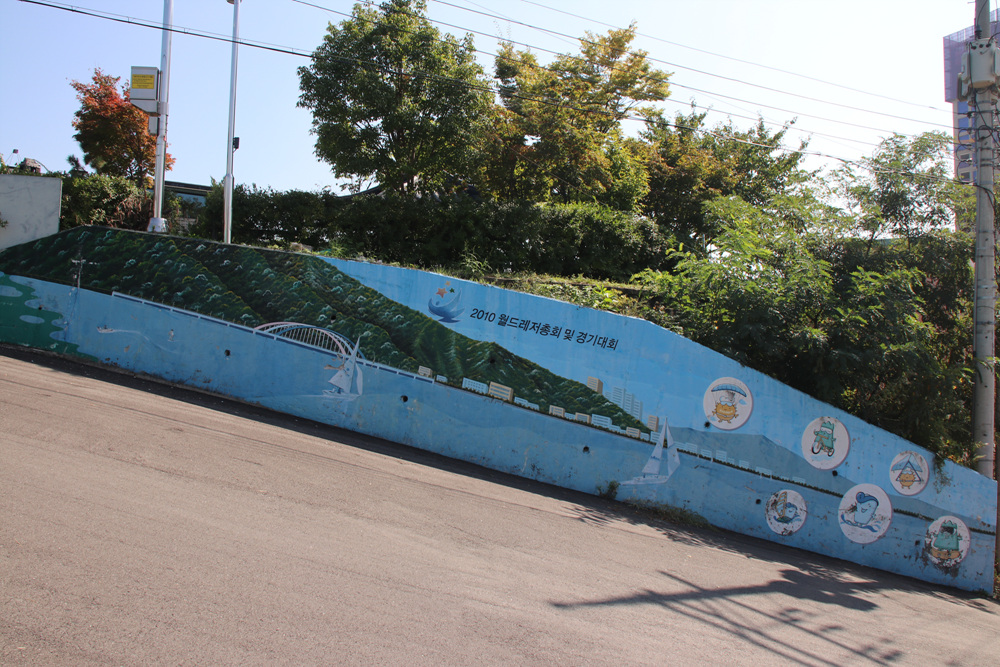 심한 경사로에 그려져 있는 벽화는 2010 월드레저총회 및 경기대회를 알리고 있는 것으로 보아 여기 벽화는 오랜 기간의 역사를 가지고 있음을 알 수 있습니다.
