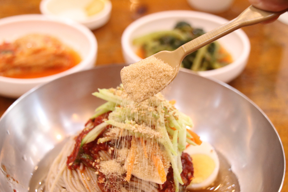 이곳 직원이 메밀막국수를 맛있게 먹는 방법을 알려주시는데 육수를 먼저 조금 넣고 마늘, 고춧가루, 양파, 파 등을 갈아서 1주일간 숙성된 양념 장위에 설탕을 스푼으로 두 번 넣어 주시고,