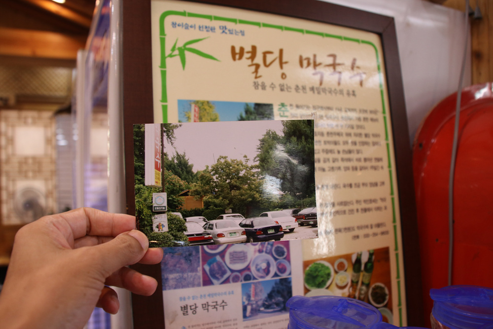 벽면을 보다가 한 패널을 보았는데 별당막국수의 옛 사진이 붙어 있습니다. 춘천시 재개발 사업으로 인해 효자동 별당막국수가 약사동으로 이전하였다고 합니다. 예전의 사진을 보니 정말 운치가 있었네요