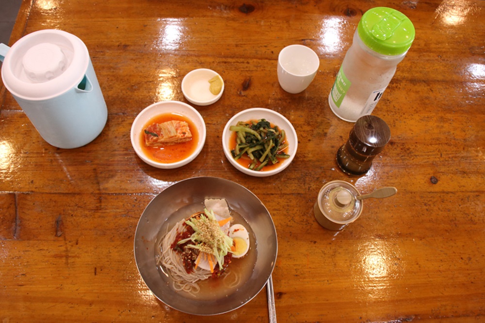잠시 후 주문한 막국수 1인분이 나왔는데요, 보기에도 먹음직스럽습니다. 먼저 면의 색이 흰색입니다. 면의 색이 흰색이라는 것은 100% 순메밀을 사용하였다는 증거입니다.