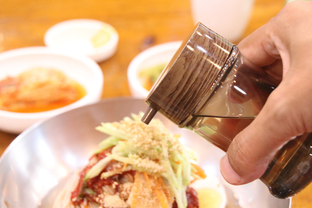 식초를 두 바퀴 돌려 넣어주면 맛있다고 합니다. 그리고 오른손으로 비비고, 왼손으로 비비고 겨자를 곁들이면 맛있는 춘천 막국수가 됩니다. 막국수 한 젓가락 하실래 예?