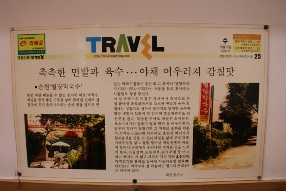 벽면을 보다가 한 패널을 보았는데 별당막국수의 옛 사진이 붙어 있습니다. 춘천시 재개발 사업으로 인해 효자동 별당막국수가 약사동으로 이전하였다고 합니다. 예전의 사진을 보니 정말 운치가 있었네요