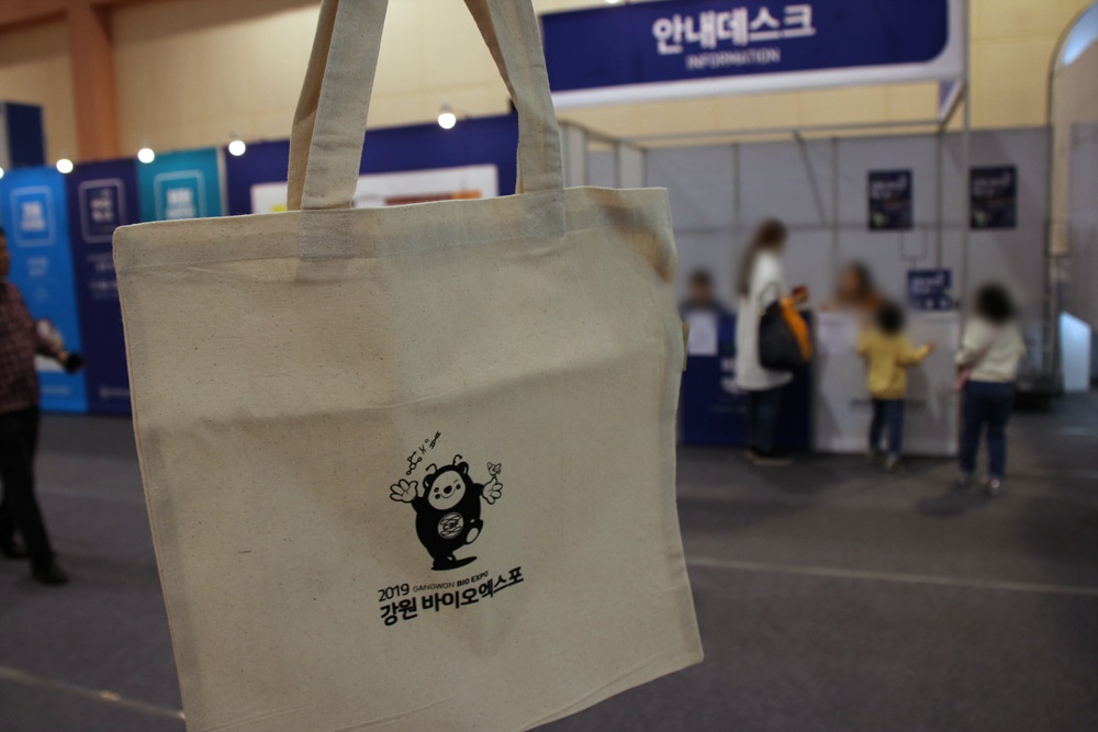 안내데스크에서는 2019 강원 바이오 엑스포 관람 앙게이트를 받고 있는데요, 작성하여 제출하면 이런 에코백을 선물로 받을 수 있습니다.