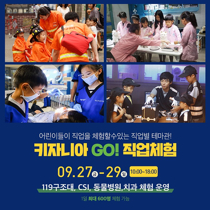 119 구조대, CSI, 동물병원, 치과 체험을 운영하고 있습니다.