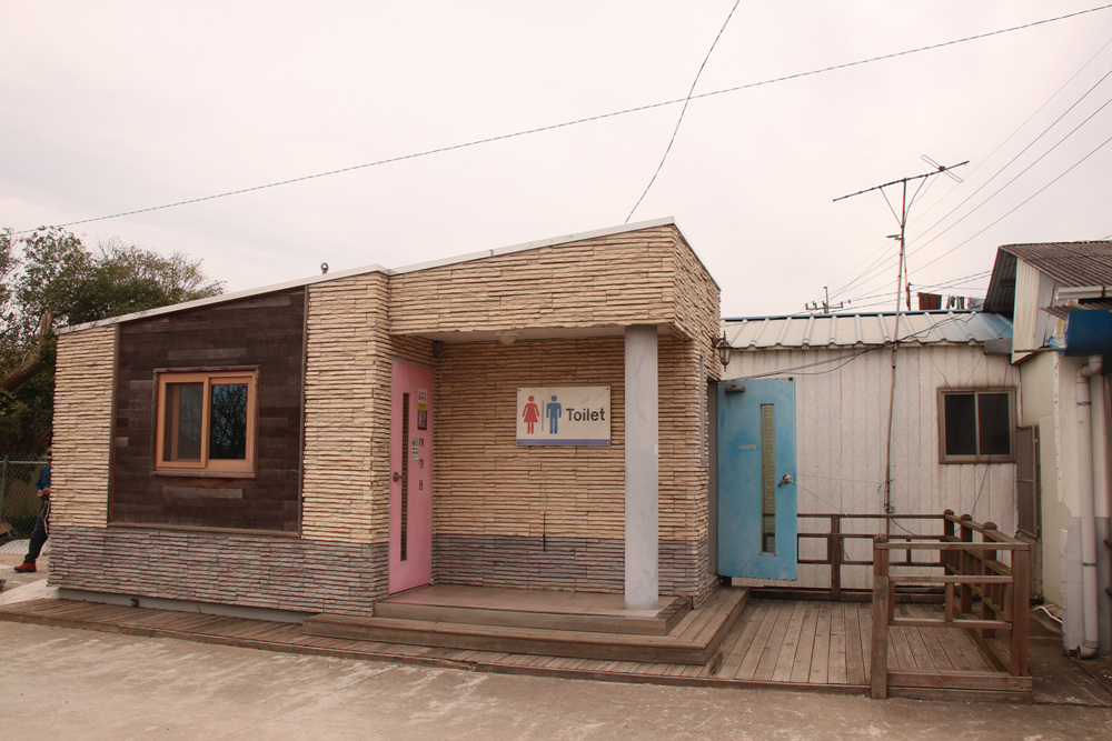 바로 옆에는 공중화장실이 멋진 외관을 갖추고 사용자를 위하여 기다리고 있습니다.