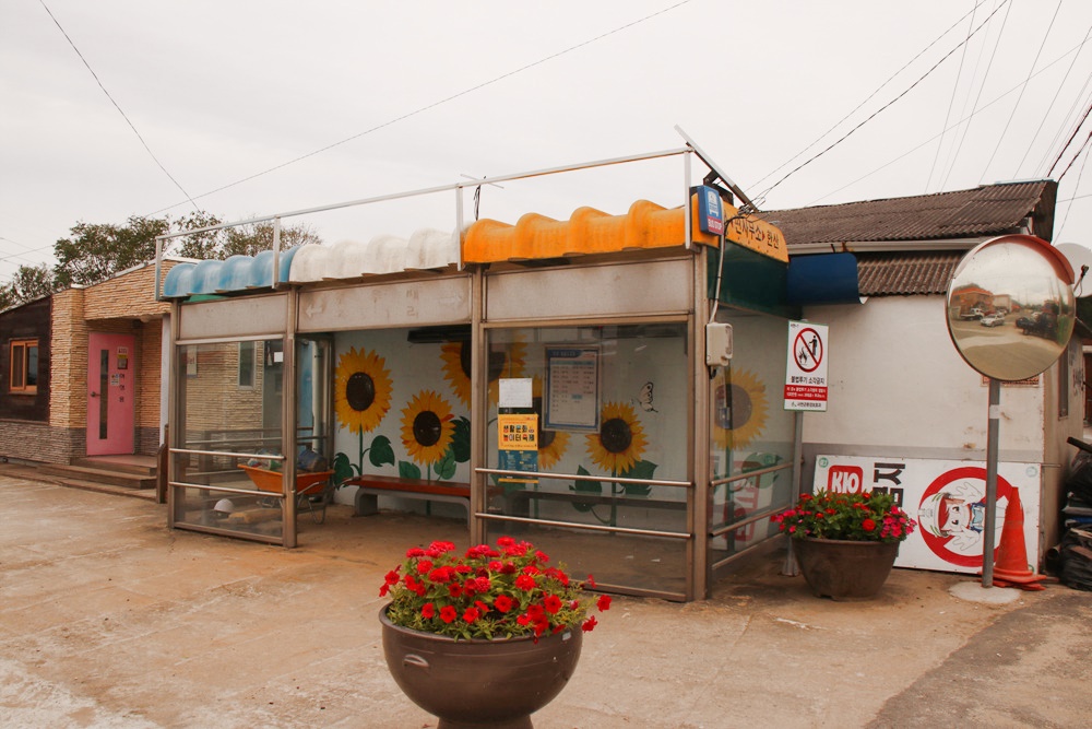 이제 마을로 다시 돌아가 버스정류장으로 갑니다.