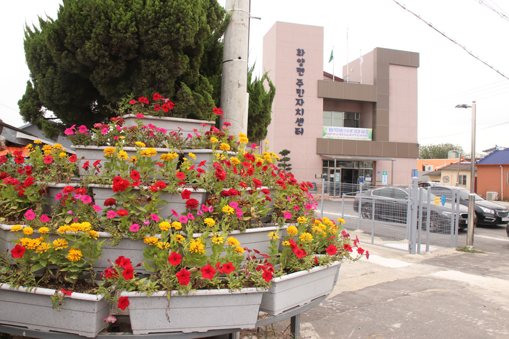 복지센터 앞 벽면에 예쁜 화분으로 꽃장식을 하여 놓아 보는 이로 하여금 기쁨을 누리게 하고 있습니다.