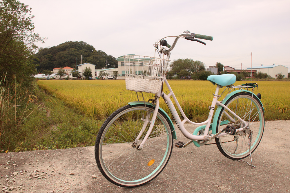 어느덧 들판은 황금색으로 변하고 있으며 꽃구경 나온 동네 아가씨의 자전거는 하나의 그림이 됩니다.