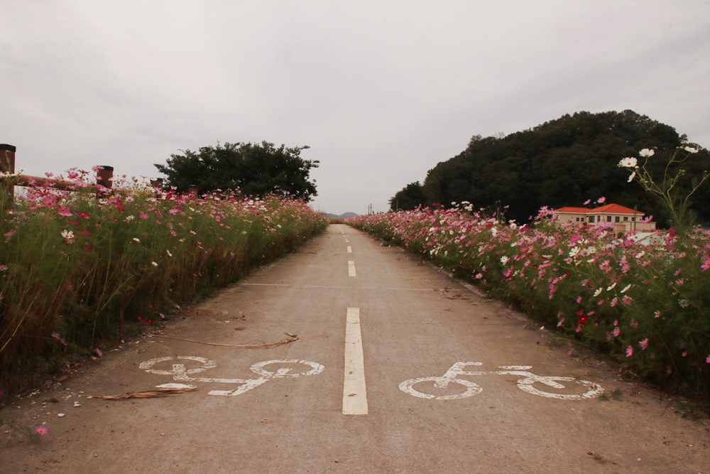서천군 화양면 금강 자전거길이 코스모스 꽃길로 단장되어 여행객을 반기고 있습니다.