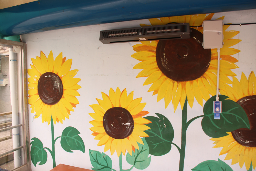 이곳 버스정류장은 한여름 무더위를 이겨내기 위하여 버스정류장 벽면에 에어송풍기를 설치하여 버턴을 누르면 일정 시간 시원한 바람이 버스를 기다리는 승객에게 가도록 설치되어 있습니다.