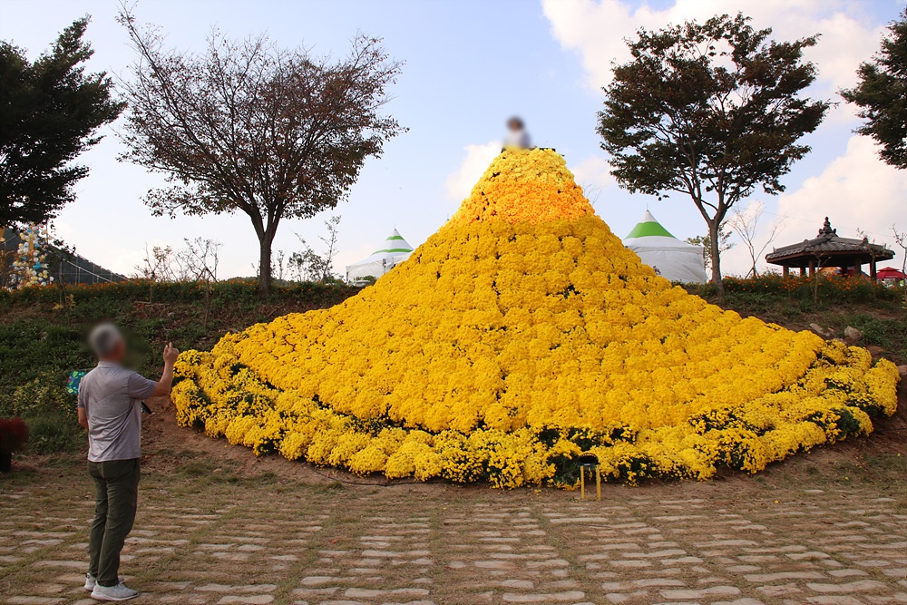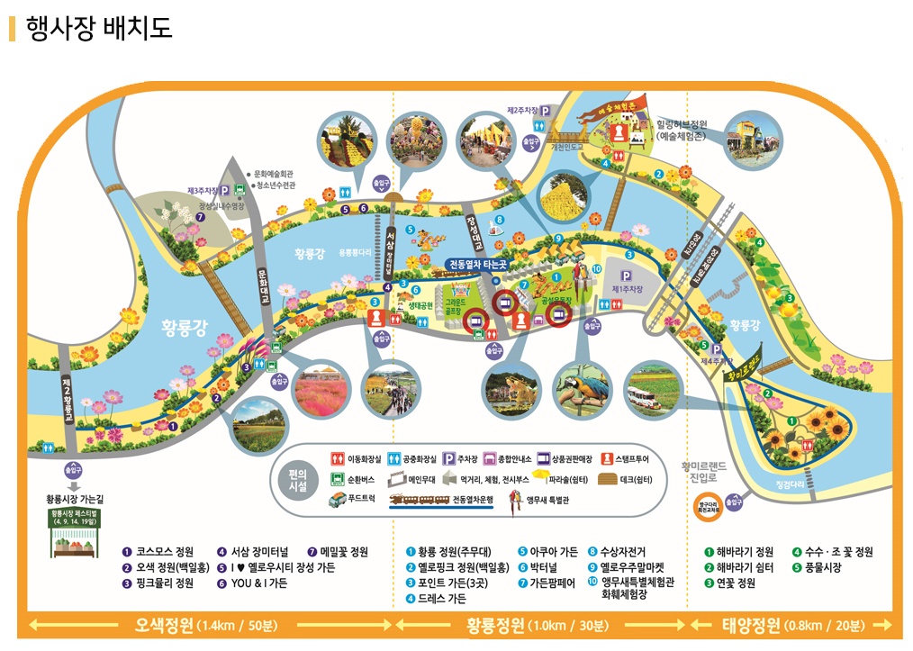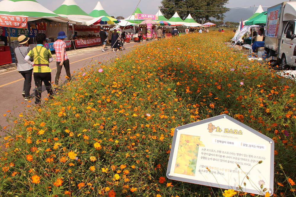 꽃으로 둘러싸인 장성황룡강노란꽃잔치 축제장의 일부 모습입니다.
