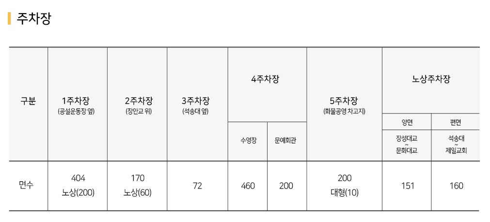 주차장은 제1주차장부터 시작하여 제5주차장까지 있어며 노상차장도 마련되어 있어 편리합니다.