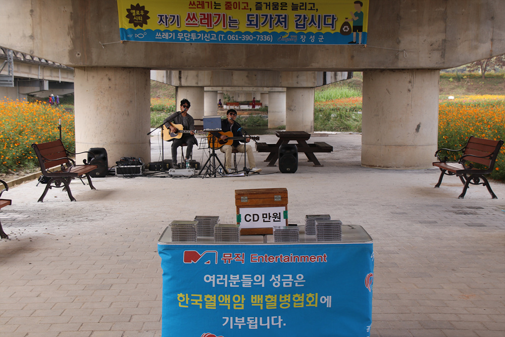 한 뮤직션이 열심히 공연을 펼치고 있는데 사람들이 꽃에 정신이 팔려서 그런지 관객이 없는 게 아쉬워 보입니다.
