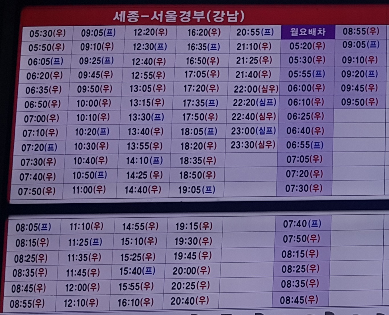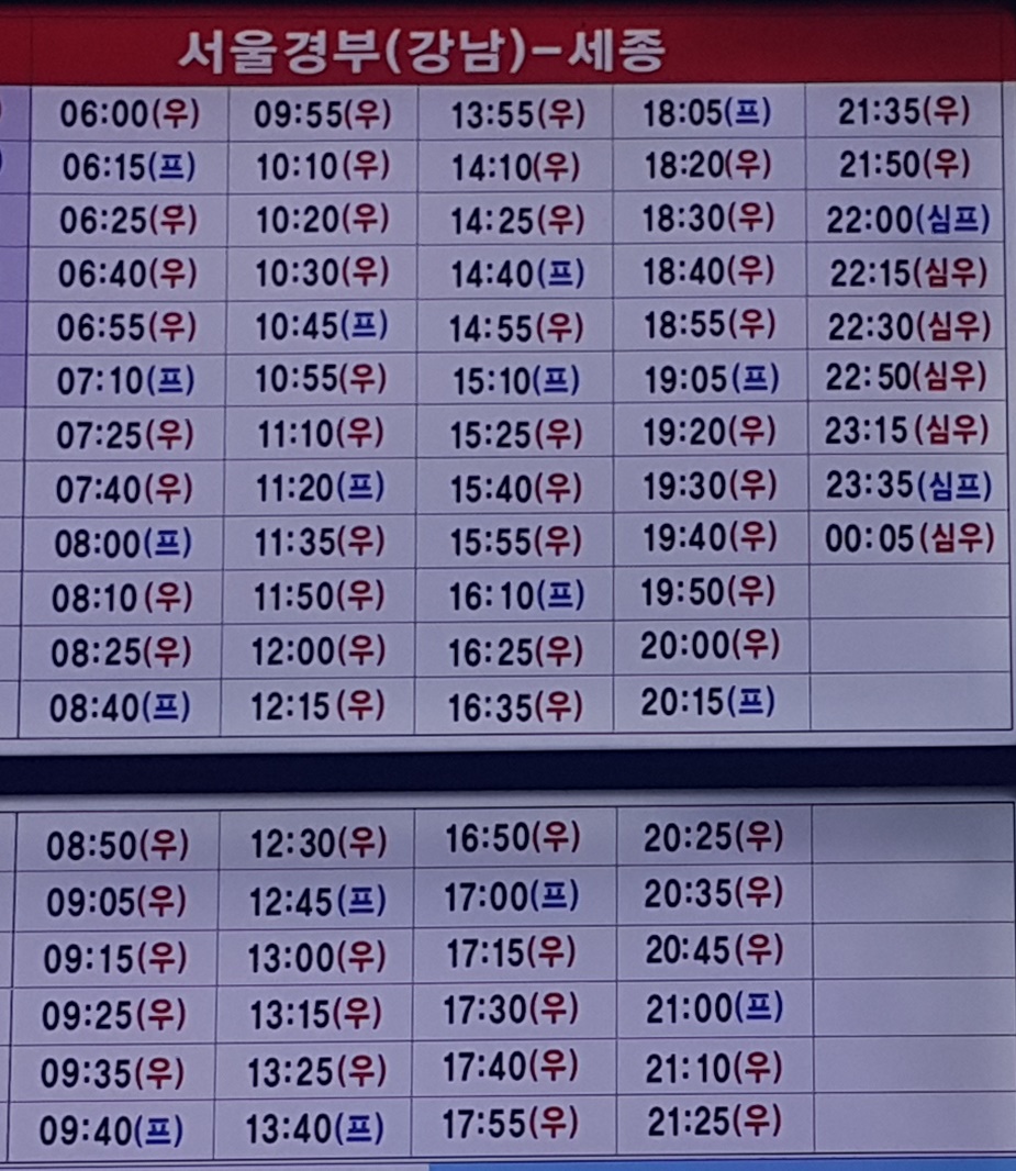 세종고속버스터미널 출발 서울 경부(강남) 방면.