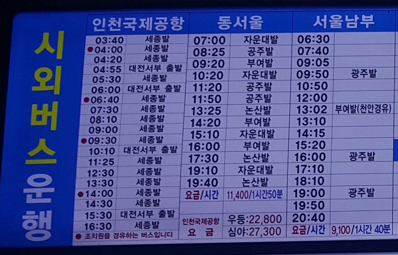 세종시외버스터미널 출발 인천국제공항, 동서울, 서울남부 방면.