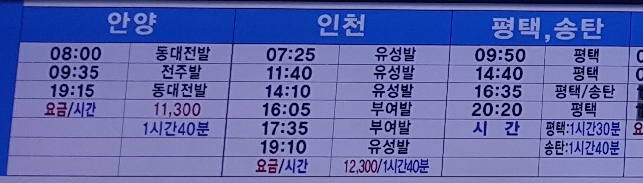 세종시외버스터미널 출발 안양, 인천, 평택 송탄 방면.
