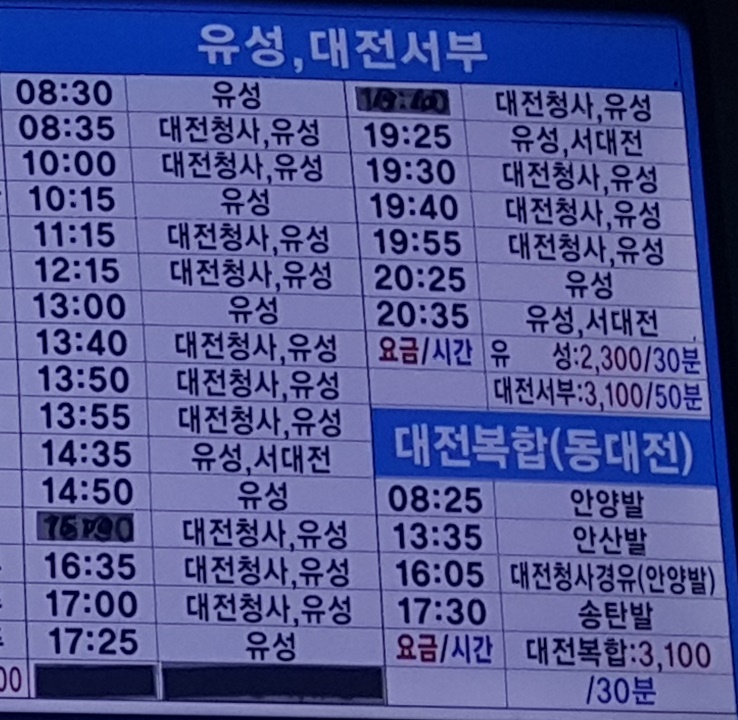 세종시외버스터미널 출발 유성, 대전서부, 대전복합(동대전) 방면.