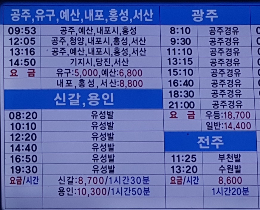 세종시외버스터미널 출발 공주, 유구, 예산, 내포, 홍성, 서산, 광주, 신갈, 용인, 전주, 방면.