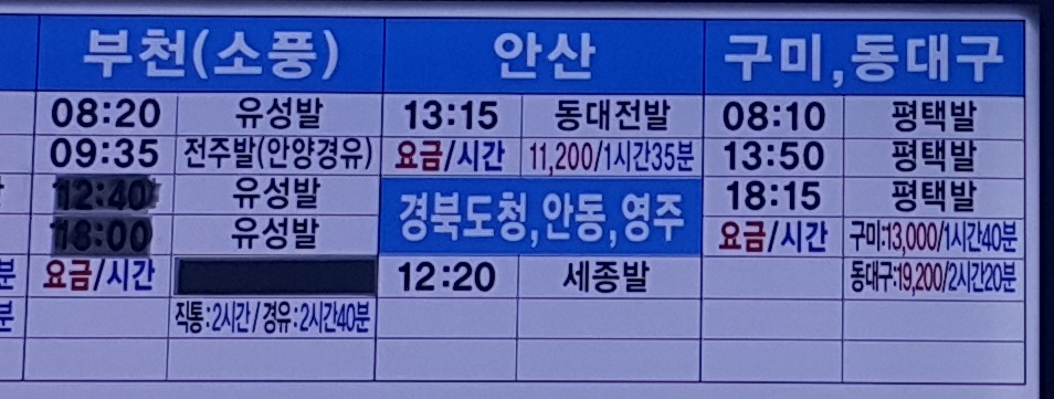 세종시외버스터미널 출발 부천(소풍), 안산, 구미, 동대구, 경북도청, 안동, 영주 방면.