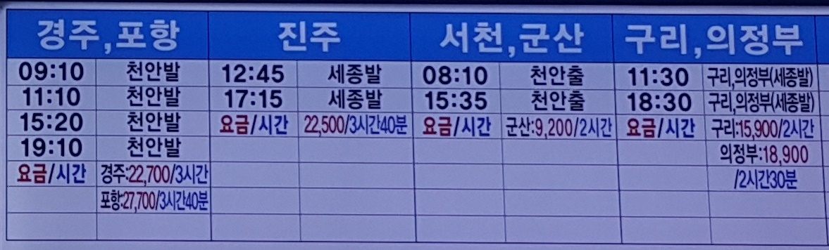 세종시외버스터미널 출발 경주, 포항, 진주, 서천, 군산, 구리, 의정부 방면.