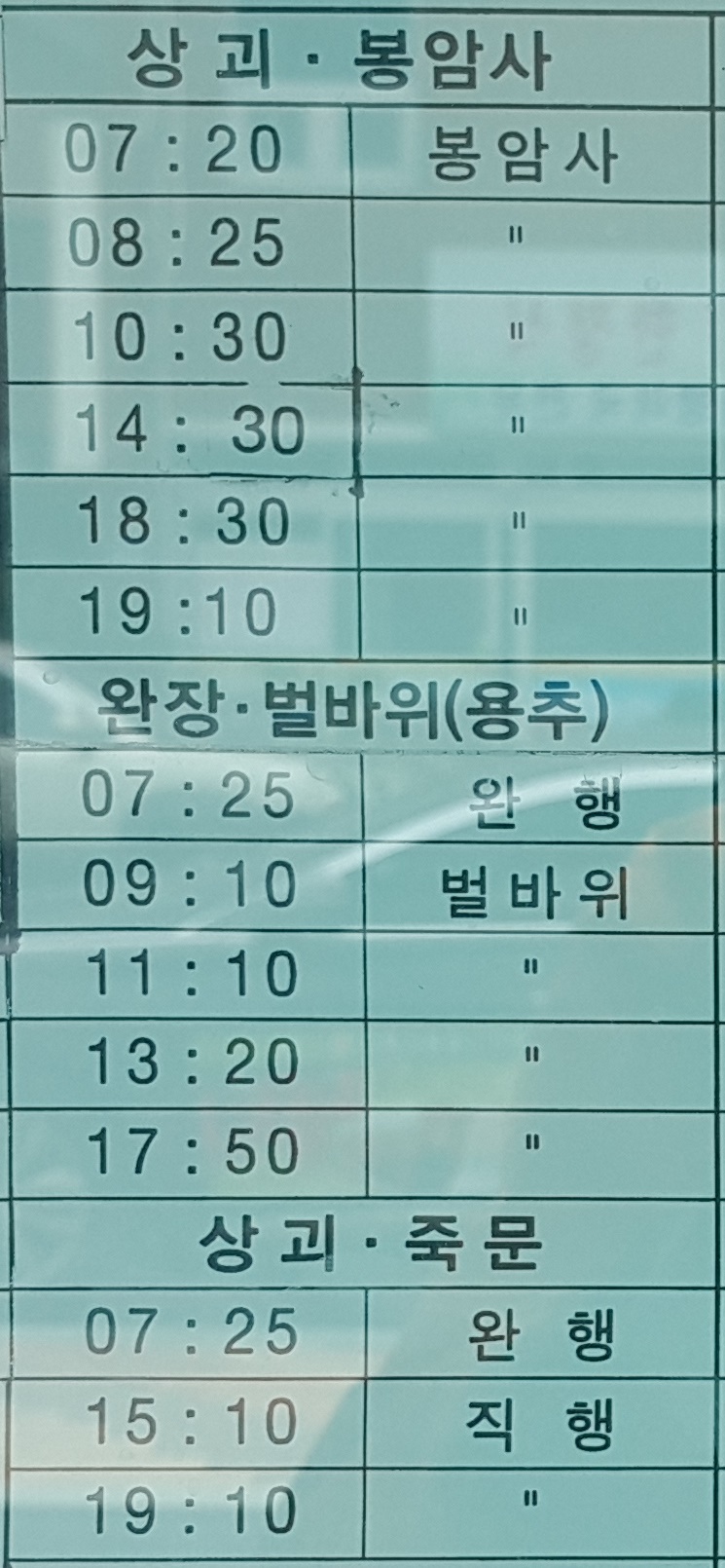 가은 아자개장터 시외버스터미널 출발 상괴, 봉암사, 완장, 벌바위(용추), 상괴, 죽문 방면.