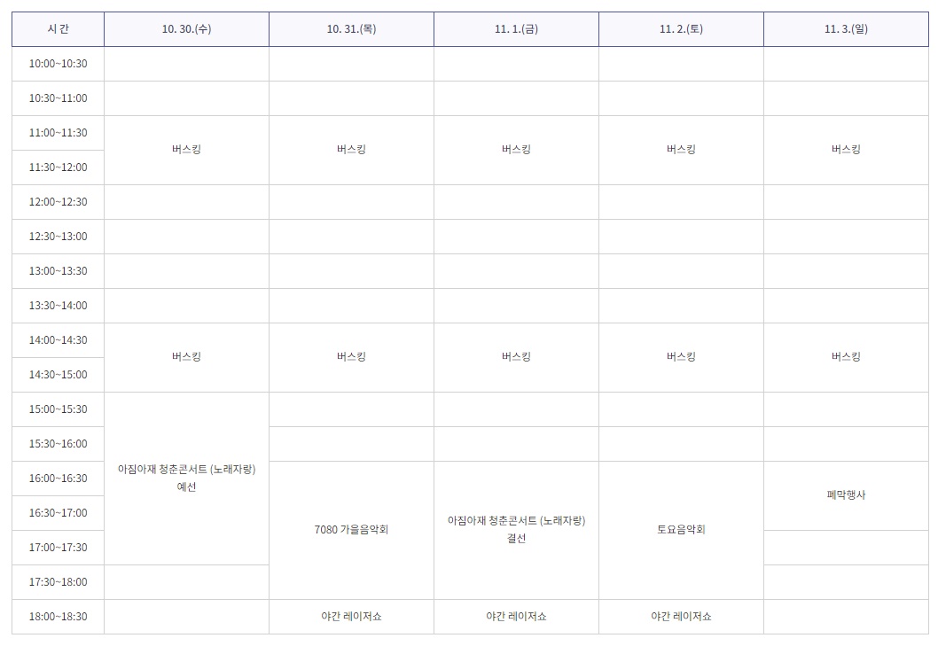 일 시 : 2019. 10. 26.(토), 10. 27.(일), 11. 2.(토), 11. 3.(일)