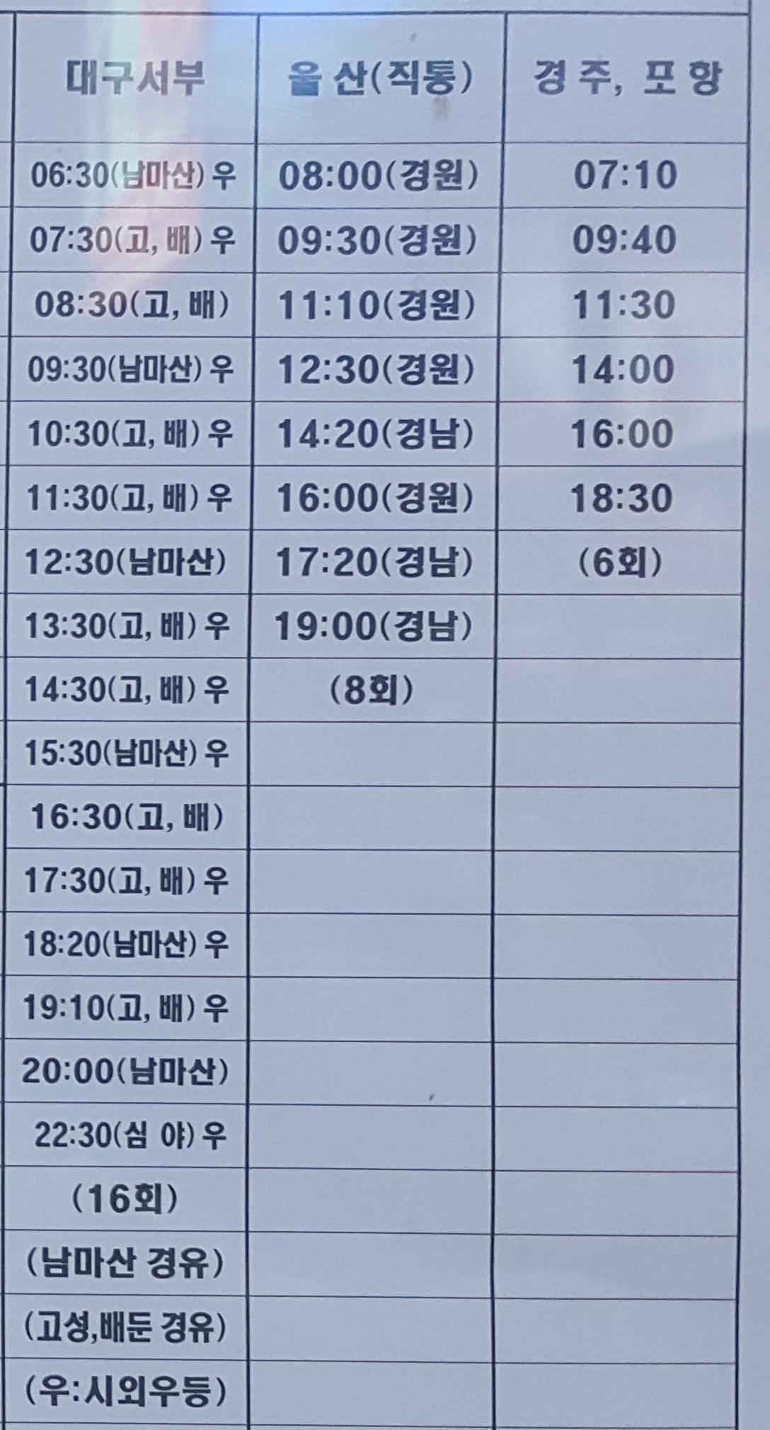 통영시외버스터미널 출발 대구서부,울산,경주,포항 방면
