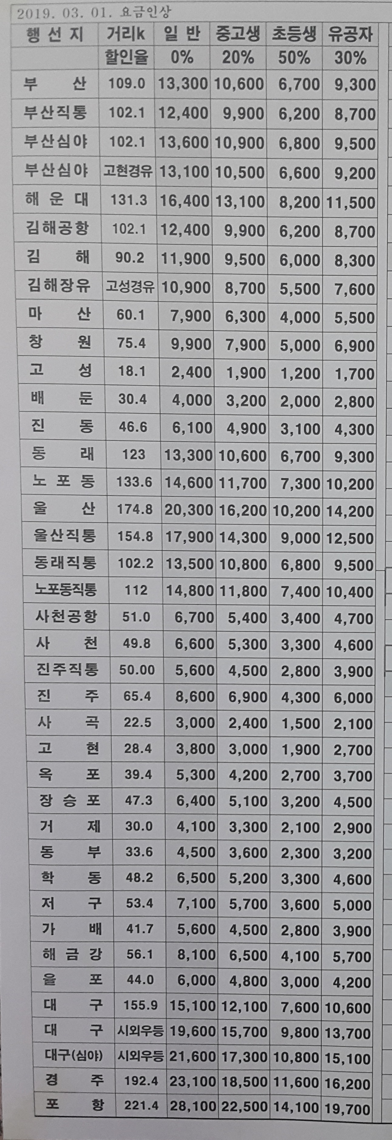 부산서부, 고성, 배둔, 진동, 마산, 부산동래, 부산동부, 노포동, 해운대,