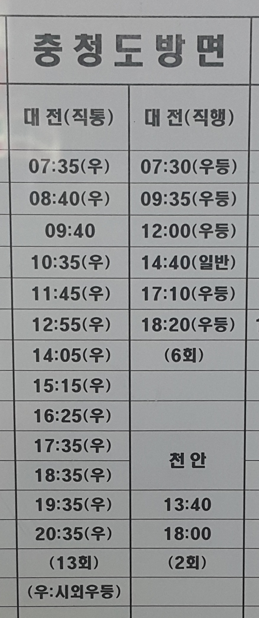 통영시외버스터미널 출발 대전, 천안, 방면