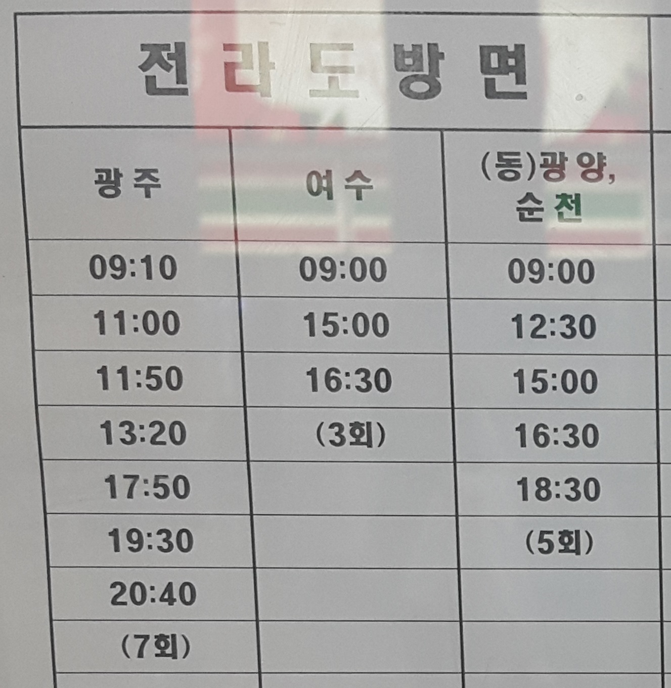 통영시외버스터미널 출발 광주, 여수, 동광양, 순천 방면