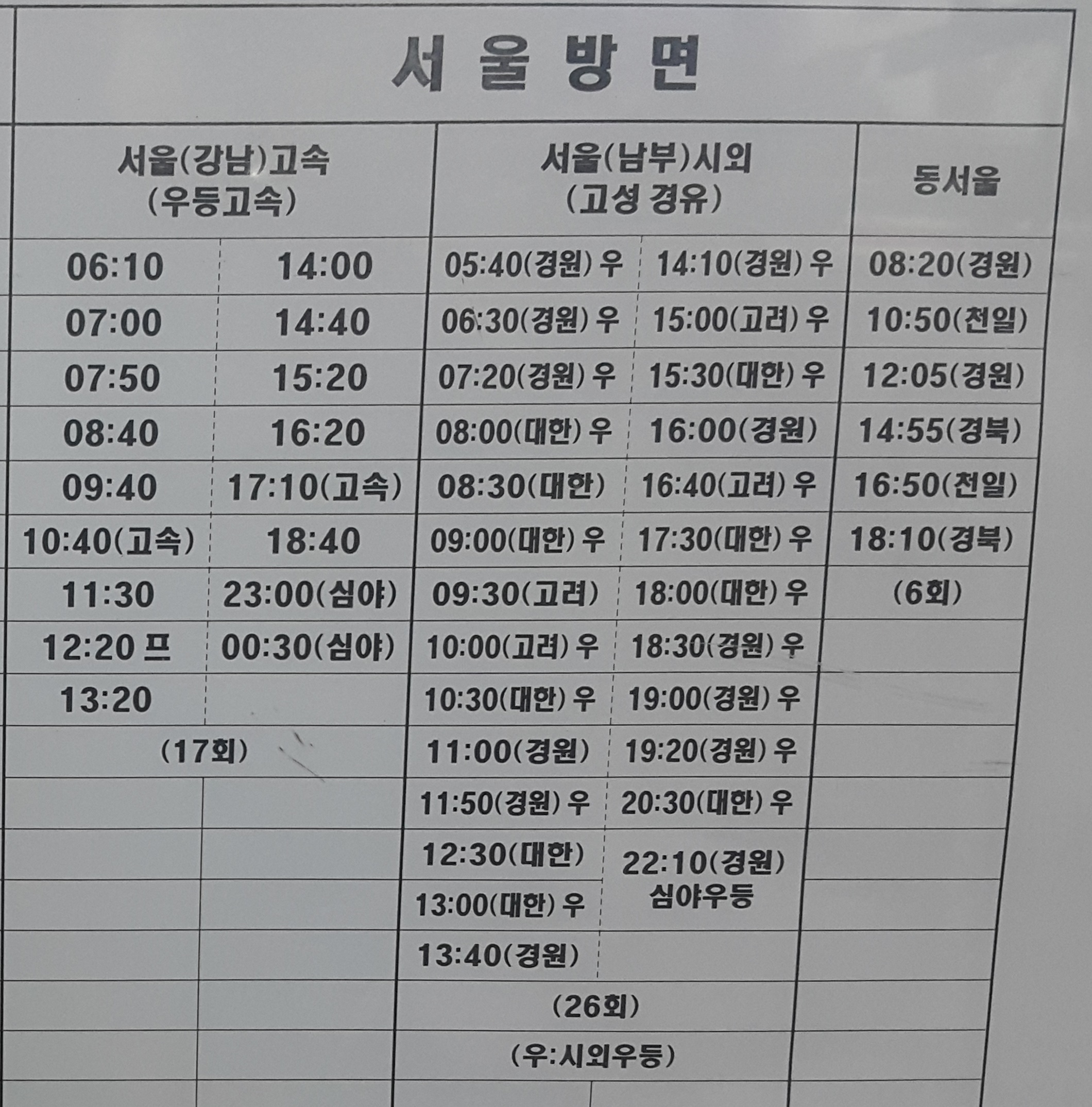 통영시외버스터미널 출발 서울 방면