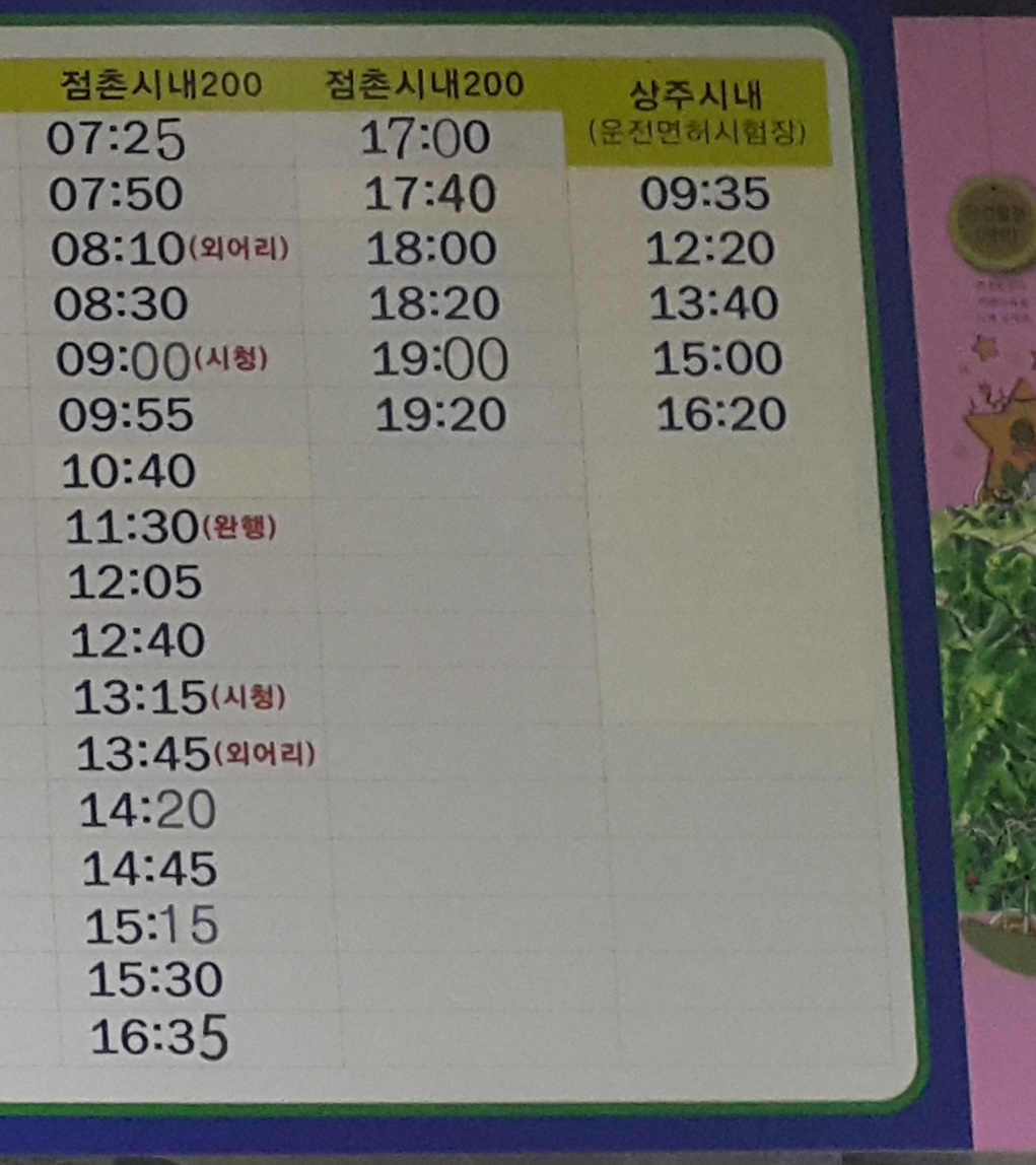 문경 출발 동서울, 수원, 고양(백석), 안산, 인천, 안양, 부천, 성남, 안동, 예천, 청주, 장호원, 이천, 충주 방면.