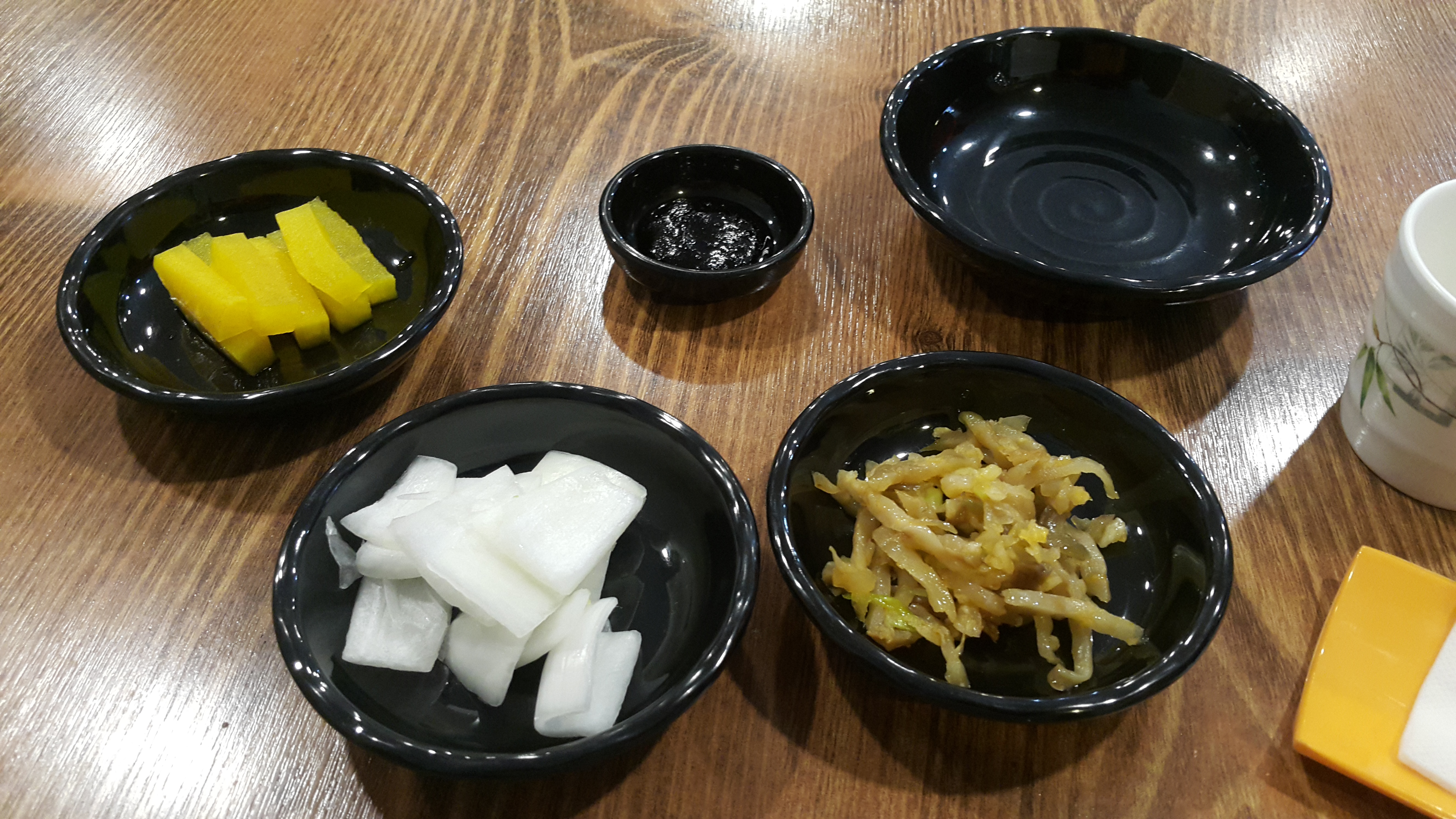 반찬은 3가지 그리고 해산물껍질 담는그릇이 있다.