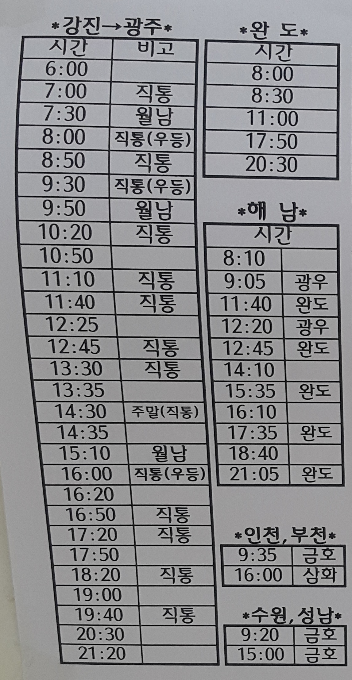 강진 출발 광주, 완도, 해남, 인천, 부천, 수원, 성남 방면.