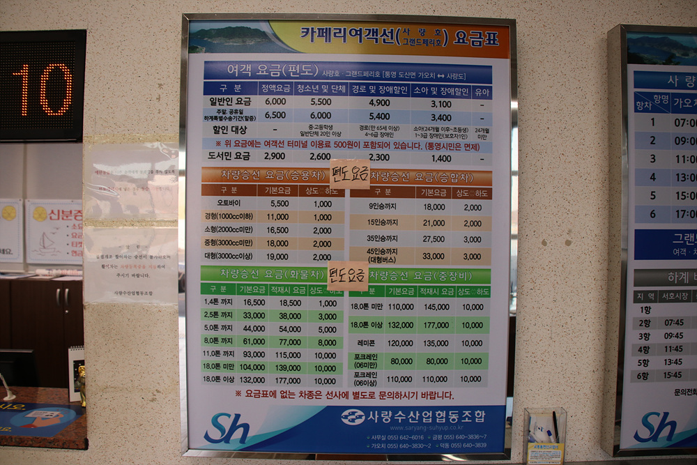 사량도여객선터미널 요금표