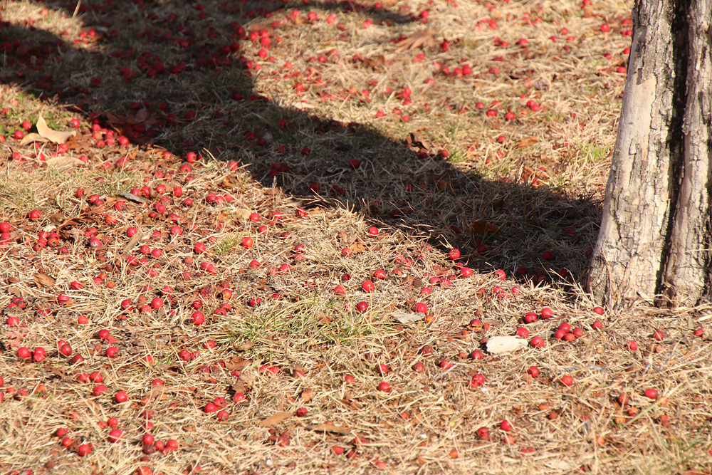 붉은 열매가 가득 떨어져 있는데 새들의 먹이가 될것 같습니다.