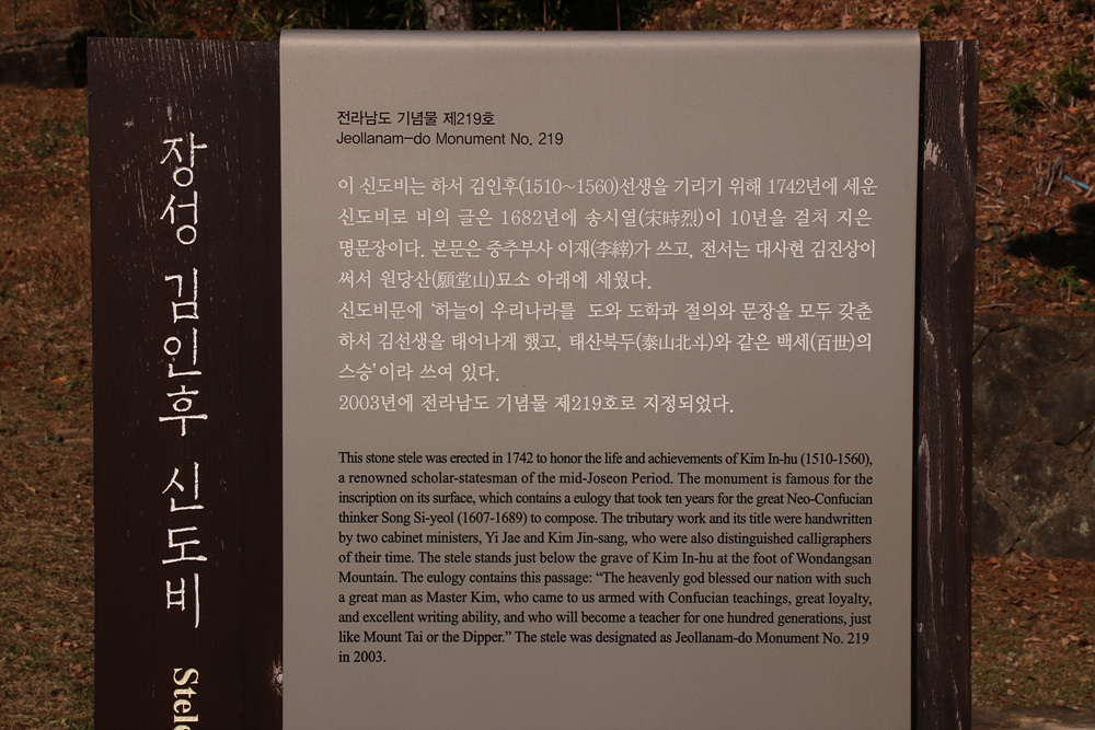 이 신도비는 하서 김인후(1510~1560) 선생을 기리기 위해 1742년(영조 18)에 세운 신도비로