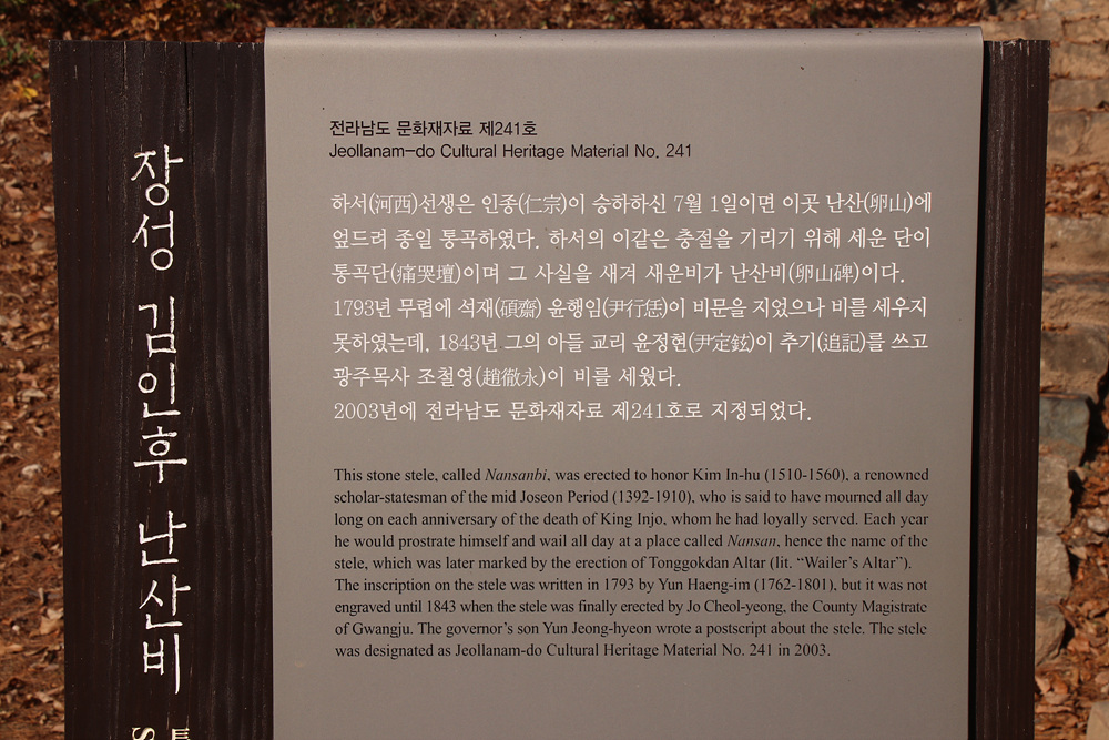 장성 김인후 신도비 전라남도 기념물 제219호 그리고 통곡단과 난산비 전라남도 문화재자료 제241호