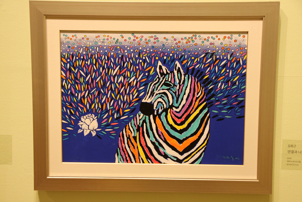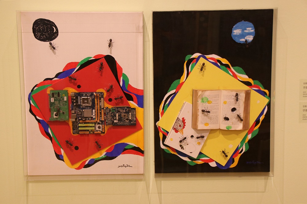 김용근 작가는 점과 선으로 만들어진 캐릭터, 말, 개미, 로봇 등 아이들이 즐거워하는 소재의 작품으로