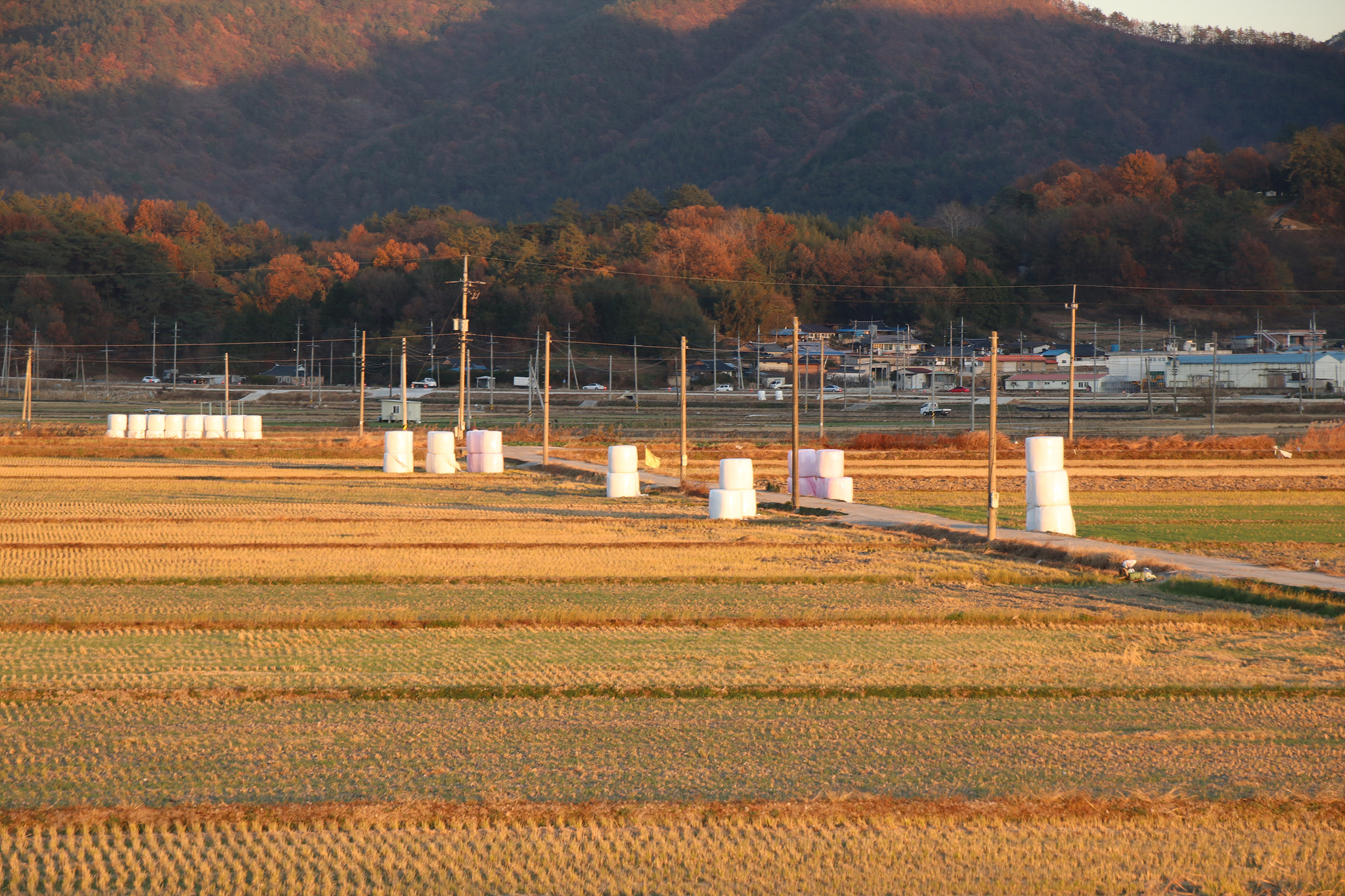 가을 추수가 끝난 들판은 짚을 돌돌 말아 보관 중인 건포 더미가 마치 아이들의 사탕처럼 보입니다.
