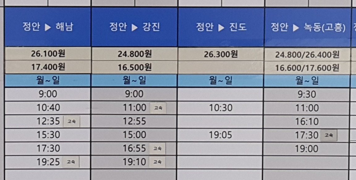 정안 출발 해남, 강진, 진도, 녹동(고흥) 방면.