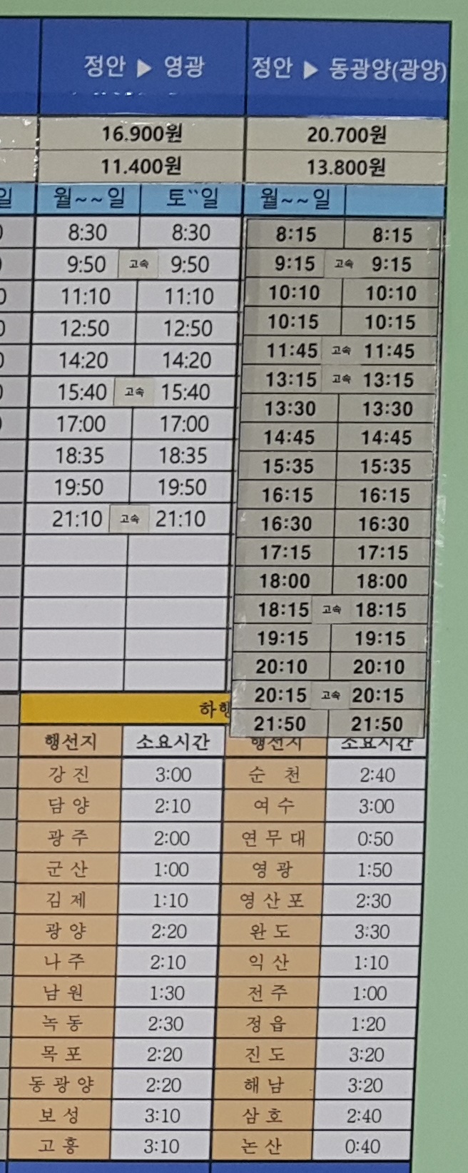 정안 출발 영산표(나주), 완도, 담양, 보성(벌교) 방면.