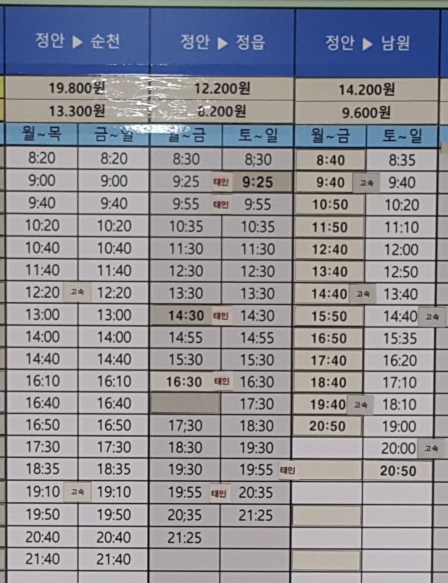 정안 출발 순천, 정읍, 남원 방면.
